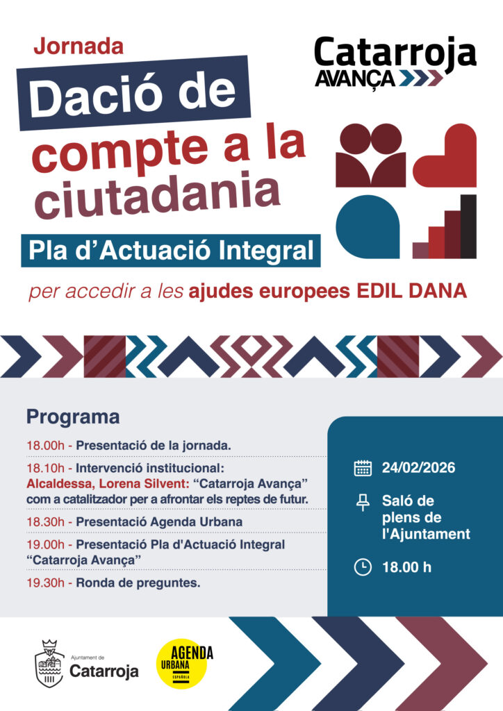 Jornada dación de cuenta a la ciudadanía Plan de Actuación Integral para acceder a las ayudas europeas EDIL DANA + Añadir Google Calendar Exportación + iCal / Outlook Fecha 24 Feb 2026 Finalizdo! Hora 18:00 - 20:00 Localización Salón de Plenos Municipal Camí Reial, 22 Organizador Ayuntamiento de Catarroja Teléfono 961 261 301 Correo electrónico adl@catarroja.es Web https://www.catarroja.es/ Compartir este evento