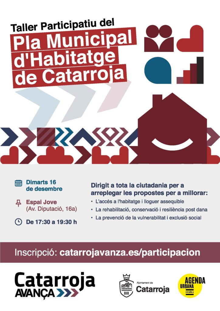 Taller Participativo «Plan Municipal de Vivienda de Catarroja» + Añadir Google Calendar Exportación + iCal / Outlook Fecha 16 Dic 2025 Finalizdo! Hora 17:30 - 19:30 Localización Espacio Joven Av. Diputació, 16a Organizador Ayuntamiento de Catarroja Teléfono 961 261 301 Correo electrónico adl@catarroja.es Web https://www.catarroja.es/ Compartir este evento