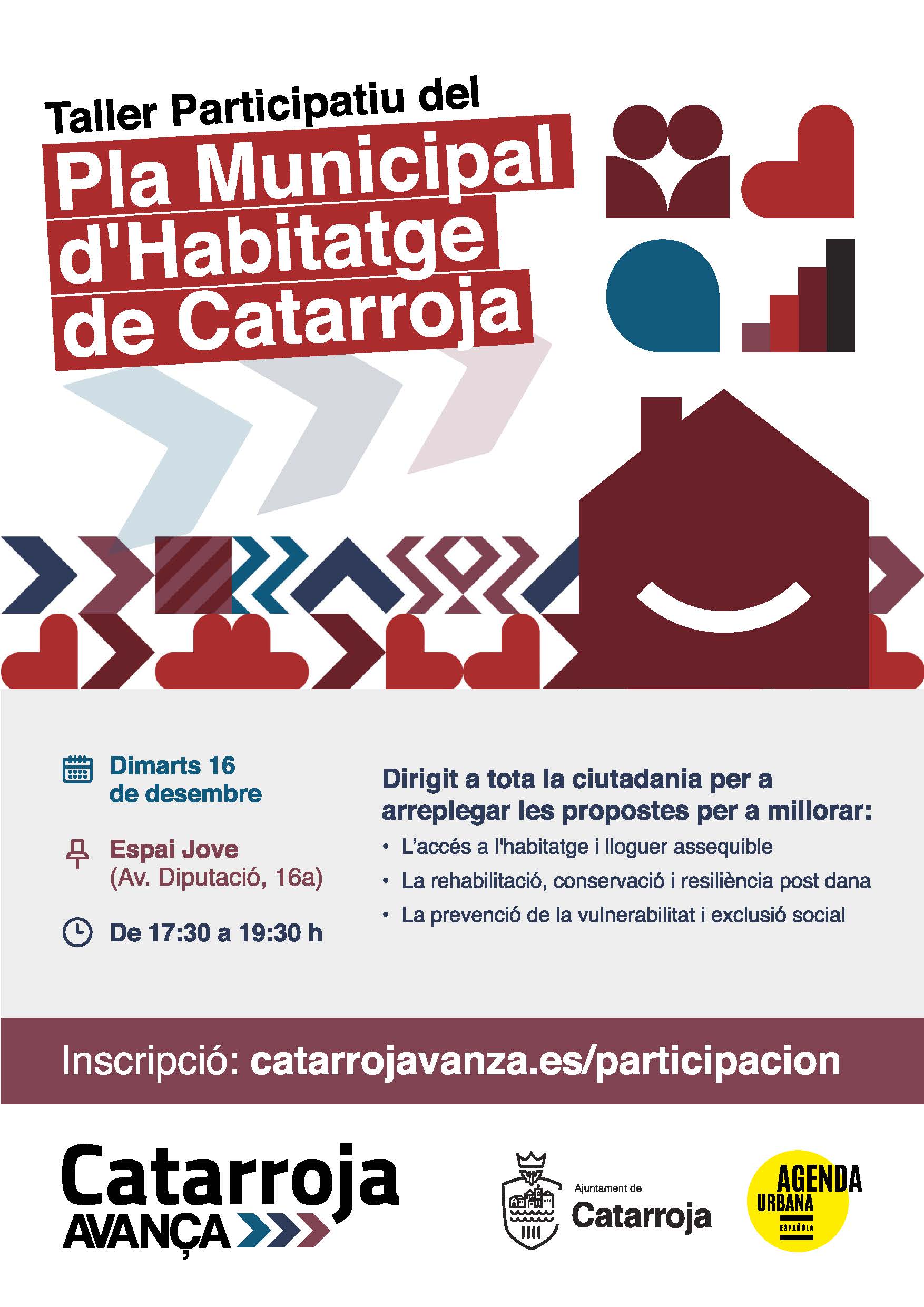 Fecha 16 Dic 2025 Finalizdo! Hora 17:30 - 19:30 Taller Participativo «Plan Municipal de Vivienda de Catarroja» Inscripción al taller Nombre y apellidos Correo electrónico Selecciona los talleres a los que deseas asistir 04/12/2025 - 17h - Taller de co-diseño de Iniciativas Vecinales 16/12/2025 - 17,30h - Taller participativo del "Plan Municipal de Vivienda" Autorizo al ayuntamiento a utilizar los presentes datos personales para el envío de información relacionada con la agenda urbana Sí No Enviar Compartir este evento + Añadir Google Calendar Exportación + iCal / Outlook